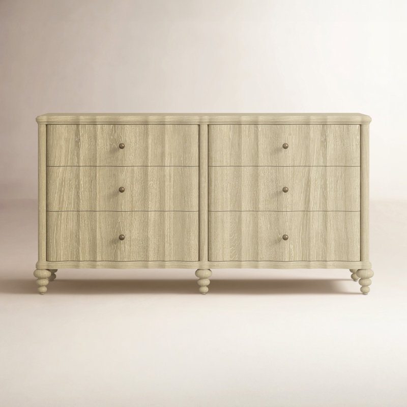Bring a touch of refined whimsy to your bedroom with the Haven Dresser that reimagines classic dresser design with delightful details inspired by vintage finds. The gently fluted drawer fronts create a sense of textural interest, reminiscent of hand-carved details found in antique furniture. The soft, finish adds a fresh, airy feel, while the delicate scalloped apron and turned feet echo the timeless charm of a countryside cottage. With its ample storage and captivating design, this dresser seam... (More Below)