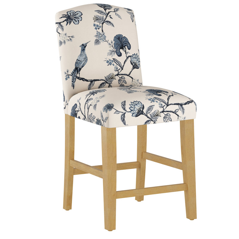 This upholstered stool is designed with a geometric pattern and comes in either a bar or counter height, making it a key ingredient to any kitchen or dining room. Its frame is made from sturdy wood and is wrapped in a fabric upholstery for added comfort. We love how the built-in footrest gives you a place to put your tired feet after a long day. Birch Lane Seat Height: Counter Stool (26” Seat Height), Upholstery: Shaana Indigo, Color: Natural WoodBirch Lane
