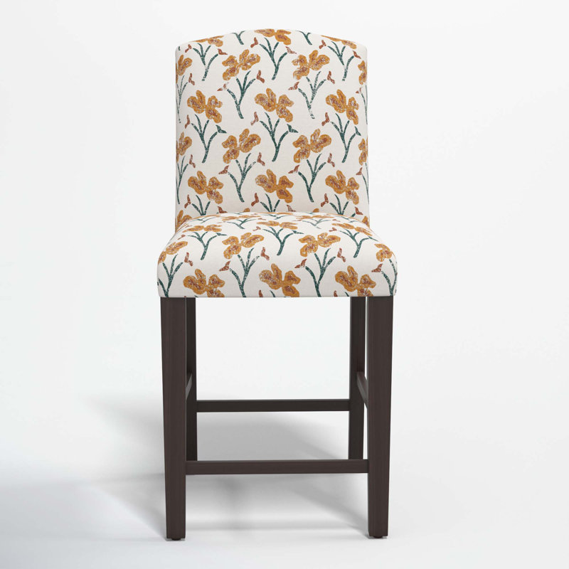 This upholstered stool is designed with a geometric pattern and comes in either a bar or counter height, making it a key ingredient to any kitchen or dining room. Its frame is made from sturdy wood and is wrapped in a fabric upholstery for added comfort. We love how the built-in footrest gives you a place to put your tired feet after a long day. Birch Lane Seat Height: Counter Stool (26” Seat Height), Upholstery: Vanves Floral Ochre Teal, Color: Black WoodBirch Lane