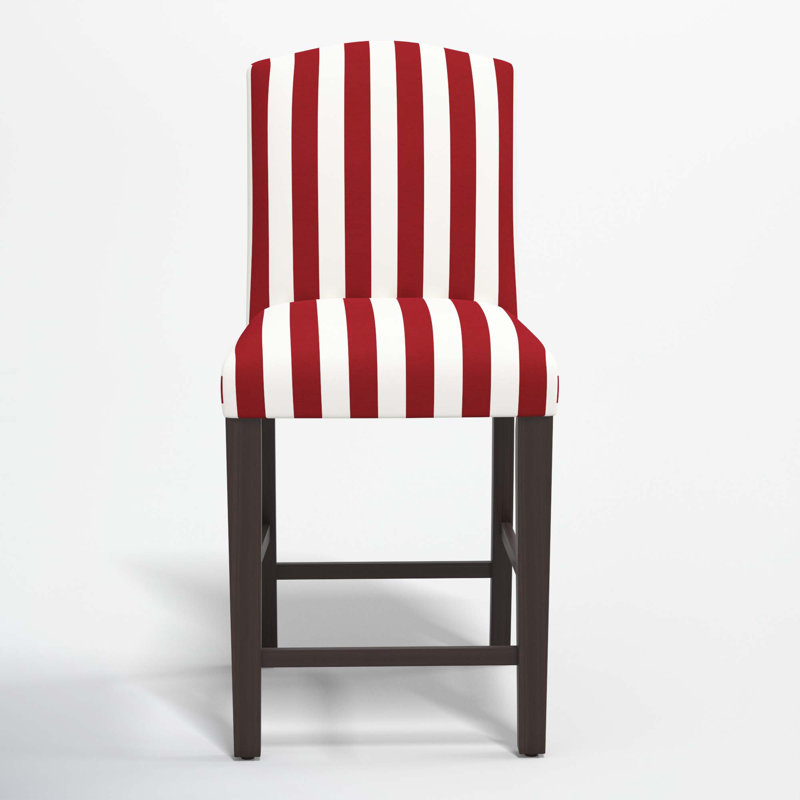 This upholstered stool is designed with a geometric pattern and comes in either a bar or counter height, making it a key ingredient to any kitchen or dining room. Its frame is made from sturdy wood and is wrapped in a fabric upholstery for added comfort. We love how the built-in footrest gives you a place to put your tired feet after a long day. Birch Lane Seat Height: Counter Stool (26” Seat Height), Upholstery: Canopy Stripe Red, Color: Black WoodBirch Lane