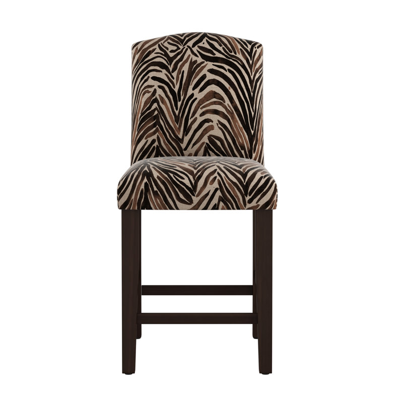 This upholstered stool is designed with a geometric pattern and comes in either a bar or counter height, making it a key ingredient to any kitchen or dining room. Its frame is made from sturdy wood and is wrapped in a fabric upholstery for added comfort. We love how the built-in footrest gives you a place to put your tired feet after a long day. Birch Lane Seat Height: Counter Stool (26” Seat Height), Color: Espresso, Upholstery: Washed Zebra ChocolateBirch Lane