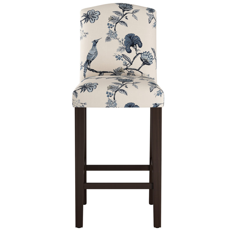 This upholstered stool is designed with a geometric pattern and comes in either a bar or counter height, making it a key ingredient to any kitchen or dining room. Its frame is made from sturdy wood and is wrapped in a fabric upholstery for added comfort. We love how the built-in footrest gives you a place to put your tired feet after a long day. Birch Lane Seat Height: Bar Stool (31” Seat Height), Upholstery: Shaana Indigo, Color: Black WoodBirch Lane