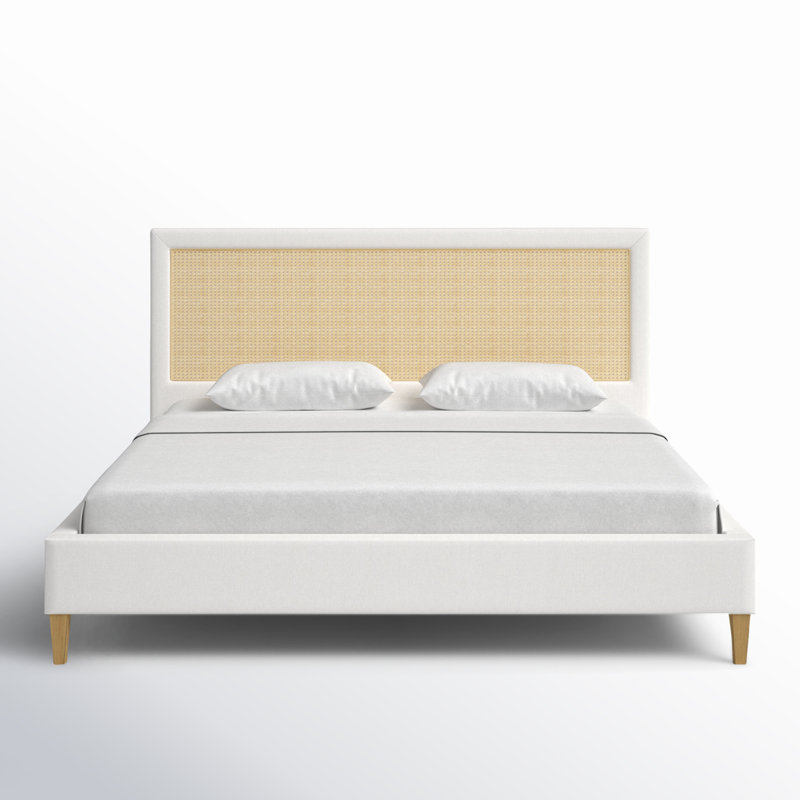 Turn your bedroom into a chic retreat with this stylish platform bed frame. Built from solid, kiln-dried wood, it?s wrapped in padded white fabric for a plush touch. A woven cane headboard and tapered wooden legs add airy natural accents to the clean silhouette. Best of all? It comes with a system of slats and center support legs to support your mattress (sold separately), so there?s no need for a box spring. Sweet dreams! Lark Manor Size: King... (More Below)