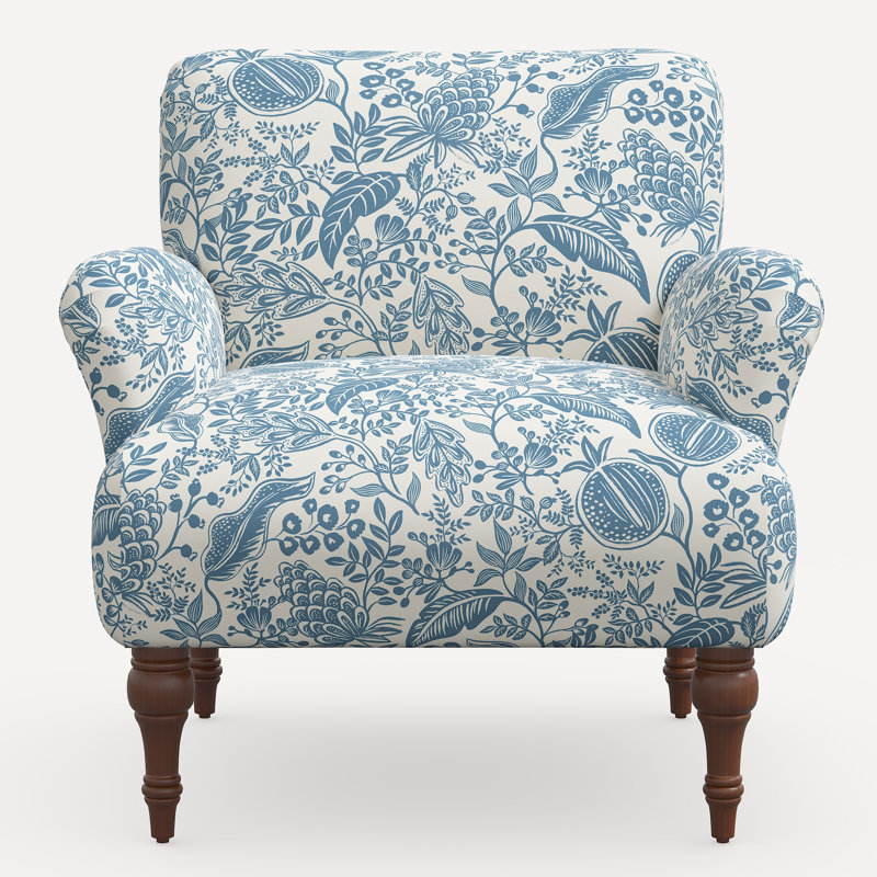 Rifle Paper Co.?s debut furniture collection features 15 classic silhouettes available in the brand?s signature prints and florals, all based on co-founder Anna Bond?s hand-painted illustrations. Body Fabric: Blue Pomegranate Linen BlendRifle Paper Co. x Cloth and Company