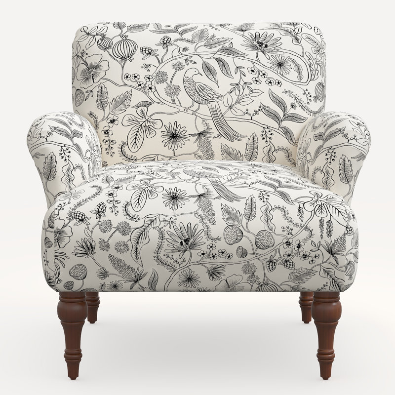Rifle Paper Co.?s debut furniture collection features 15 classic silhouettes available in the brand?s signature prints and florals, all based on co-founder Anna Bond?s hand-painted illustrations. Body Fabric: Black Aviary Linen BlendRifle Paper Co. x Cloth and Company