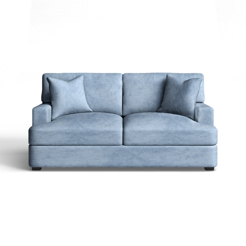 Relax in comfort with this plush loveseat. This design features back and seat cushions that will stay firmly in place while you lounge. The cushions are filled with foam, which makes for an especially comfortable seat. Recessed arms frame the piece and add to the relaxed vibe. A low front rail gives the piece a low-profile silhouette, while finished wood legs round it out in style. Wayfair Custom Upholstery Body Fabric: Bella Ocean Performance VelvetWayfair Custom Upholstery
