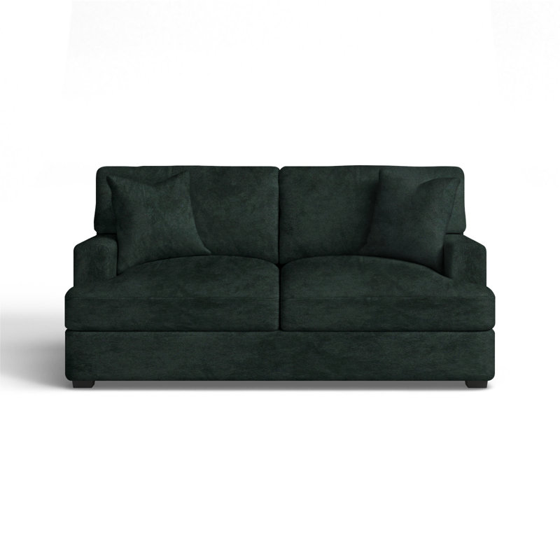 Relax in comfort with this plush loveseat. This design features back and seat cushions that will stay firmly in place while you lounge. The cushions are filled with foam, which makes for an especially comfortable seat. Recessed arms frame the piece and add to the relaxed vibe. A low front rail gives the piece a low-profile silhouette, while finished wood legs round it out in style. Wayfair Custom Upholstery Body Fabric: Bella Hunter Performance VelvetWayfair Custom Upholstery