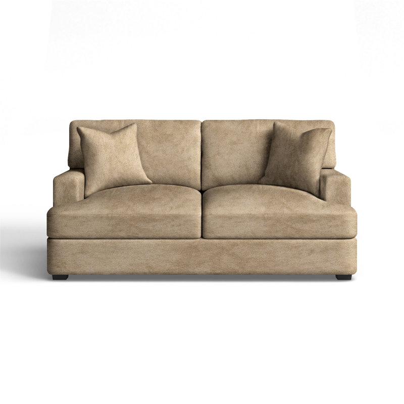 Relax in comfort with this plush loveseat. This design features back and seat cushions that will stay firmly in place while you lounge. The cushions are filled with foam, which makes for an especially comfortable seat. Recessed arms frame the piece and add to the relaxed vibe. A low front rail gives the piece a low-profile silhouette, while finished wood legs round it out in style. Wayfair Custom Upholstery Body Fabric: Bella Toast Performance VelvetWayfair Custom Upholstery