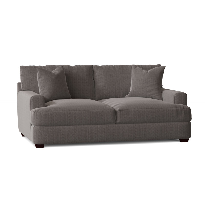 Relax in comfort with this plush loveseat. This design features back and seat cushions that will stay firmly in place while you lounge. The cushions are filled with foam, which makes for an especially comfortable seat. Recessed arms frame the piece and add to the relaxed vibe. A low front rail gives the piece a low-profile silhouette, while finished wood legs round it out in style. Wayfair Custom Upholstery Body Fabric: Zula CharcoalWayfair Custom Upholstery