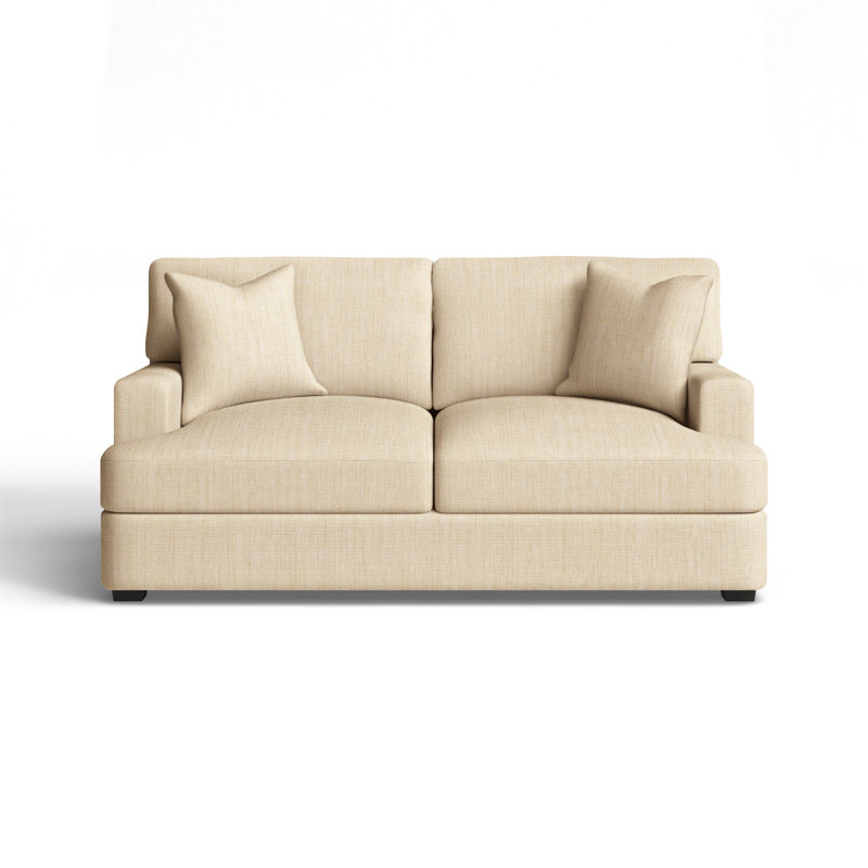 Relax in comfort with this plush loveseat. This design features back and seat cushions that will stay firmly in place while you lounge. The cushions are filled with foam, which makes for an especially comfortable seat. Recessed arms frame the piece and add to the relaxed vibe. A low front rail gives the piece a low-profile silhouette, while finished wood legs round it out in style. Wayfair Custom Upholstery Body Fabric: Sunbrella Canvas FlaxWayfair Custom Upholstery