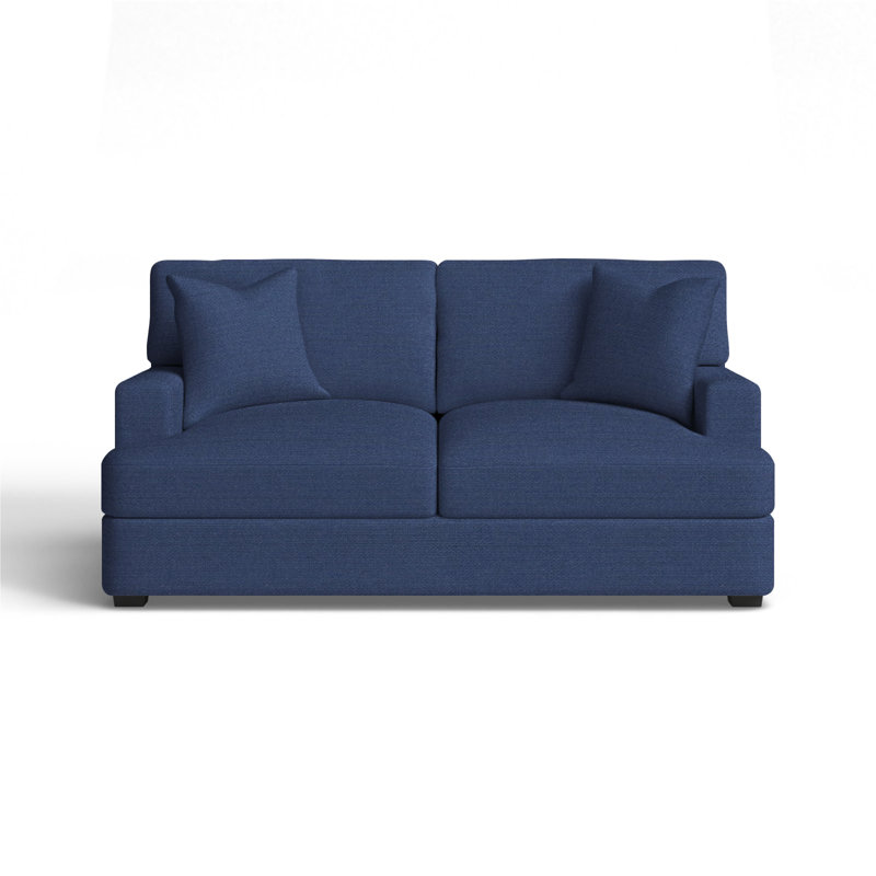 Relax in comfort with this plush loveseat. This design features back and seat cushions that will stay firmly in place while you lounge. The cushions are filled with foam, which makes for an especially comfortable seat. Recessed arms frame the piece and add to the relaxed vibe. A low front rail gives the piece a low-profile silhouette, while finished wood legs round it out in style. Wayfair Custom Upholstery Body Fabric: Sunbrella Canvas NavyWayfair Custom Upholstery